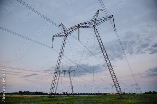 Large metal supports of power lines passing through agrarian fields. High voltage lines