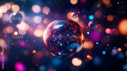 Large metallic glass orb surrounded by smaller orbs, vibrant color reflections, transparent surfaces with intricate inner details, cosmic background, ethereal glow, high-res digital art