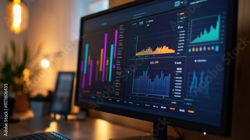 Large monitor displays various colorful financial charts and graphs, indicating data analysis and market trends in a comfortable home office setting with warm lighting