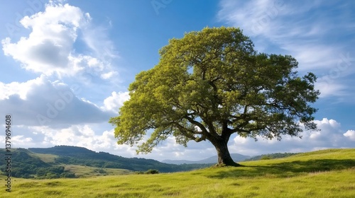 Large oak tree standing on a green hill in spring