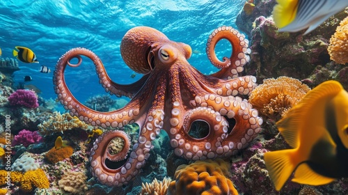 Large octopus hiding in coral shadows underwater scene marine life tropical reef close-up view mystical ocean concept