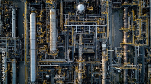Large pipelines and refinery equipment, arranged in an intricate web of machinery against a bright industrial backdrop.