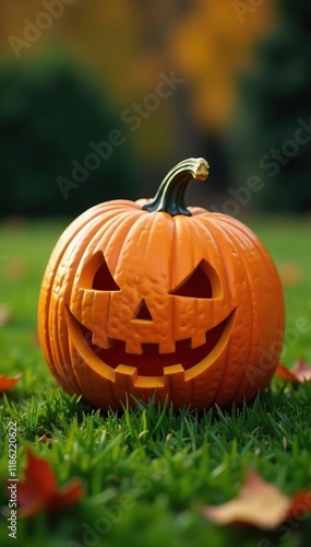 Large pixelated pumpkin on a green grassy lawn with autumn leaves, lawn, spooky