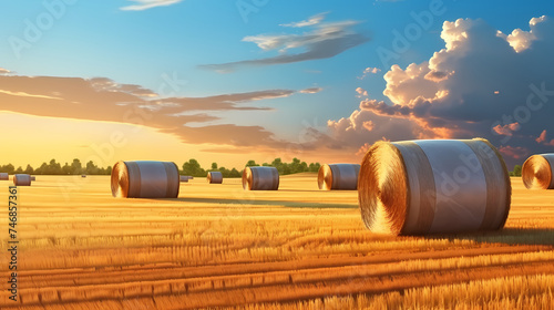 Large rolls of hay in field after harvest, rural landscape with rolls of hay in mature wheat field