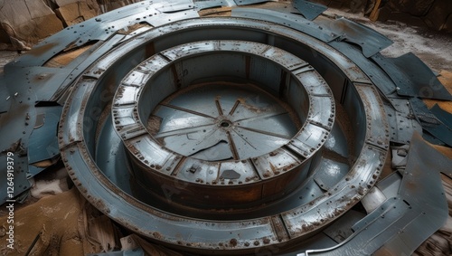 Large rusted industrial circular metal structure abandoned in debris with textured surface and intricate design Copy Space