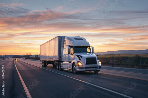 Large semi-truck traveling along a highway through a picturesque countryside during a stunning sunset, capturing the beauty of the open road