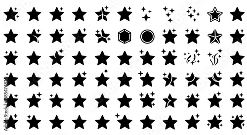 Large set of black star vector icons featuring various styles like solid, outlined, sparkling, broken, and unique designs for UI, ratings, and achievements.