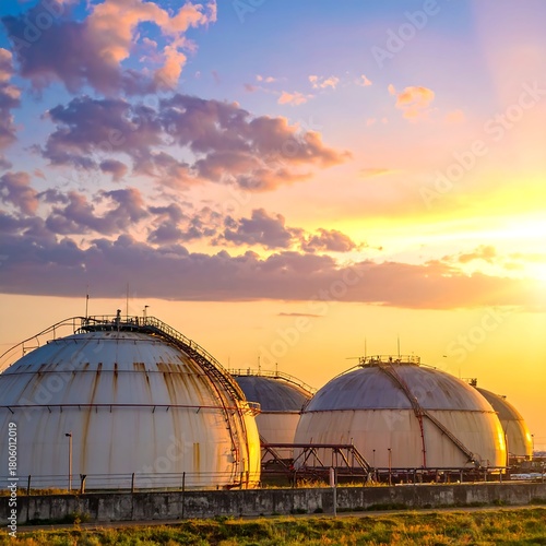 Large, spherical storage tanks are silhouetted against a vibrant sunset sky filled with clouds and the golden glow of the sun