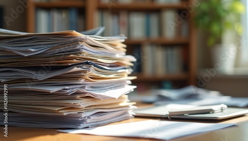 Large stack of papers on wooden desk. Documents, files, paperwork pile in office workspace. Business, administration, archive concept. Bookshelf background. Study place, workflow, knowledge, work.