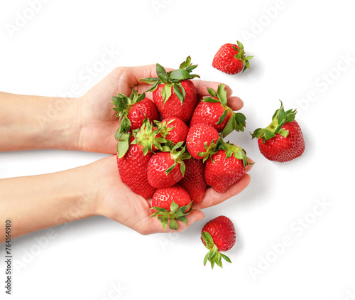 Large strawberries in a female hand on a white background, top view.