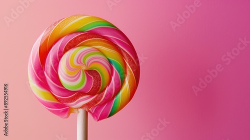 Large swirl lollipop candy with a glossy finish, against a pastel background