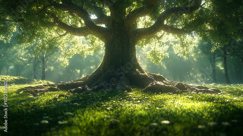 large trees with sprawling roots grounded in lush green grass. The deep roots symbolize stability, strength, and resilience, connecting nature to life's enduring growth