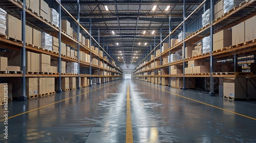 Large warehouse with many cardboard boxes neatly arranged on shelves. Distribution chain, goods storage, export, import, shipping and delivery concept.