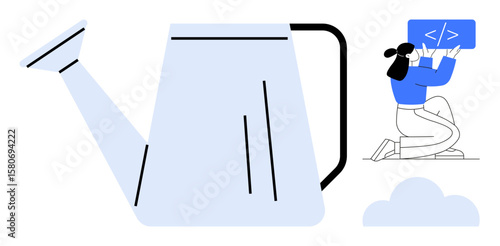 Large watering can beside a kneeling woman holding a coding illustration. Growth, innovation, creativity, technology, learning, teamwork, sustainability. Ideal for tech education projects mindset