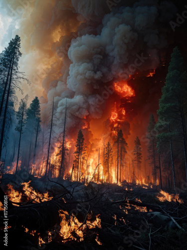 Large-scale forest fire with fierce flames and clouds of dark smoke, highlighting the devastation of wildfires. Generative AI