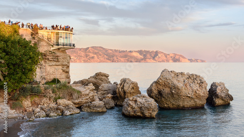 Lateral view of the Balcony of Europe at sunset on the Mediterranean Sea in Nerja. Malaga, Spain.