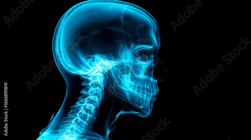 Lateral X-ray image of human skull and cervical spine on black background