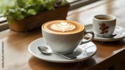 Latte Art Coffee Cup with Espresso on Wooden Table by Window
