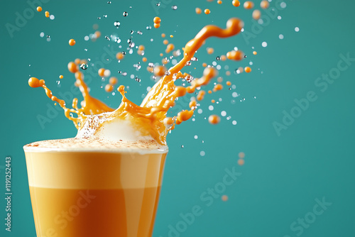 Latte cascades with splashes against a turquoise background, capturing liquid motion in a vibrant setting