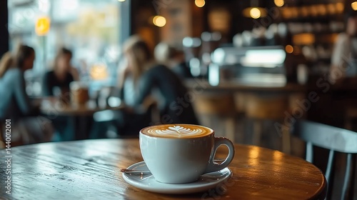 Latte with heart-shaped foam on a wooden table in a cozy café.