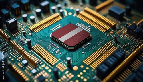 Latvia flag on a processor, CPU or microchip on a motherboard. Concept for the battle of global microchips production.