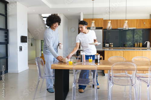 Laughing Diverse male friends standing at open-plan kitchen table, with mugs and breakfast plates