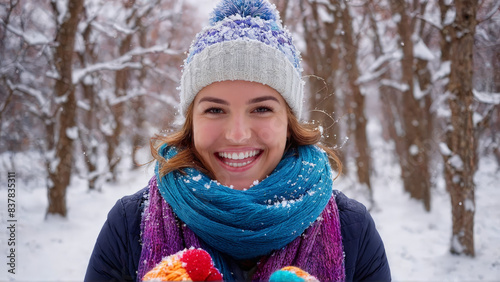 Laughing woman having snowball fight trees covered in snow colorful scarf and mittens powder flying