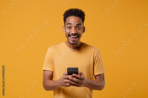 Laughing young african american guy in casual t-shirt posing isolated on yellow orange background studio portrait. People lifestyle concept. Mock up copy space. Using mobile phone, typing sms message.
