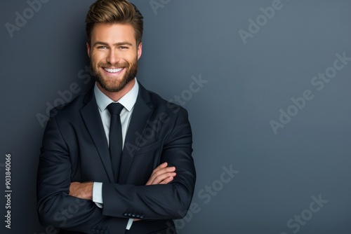 Laughing young businessman in black suit and tie posing with hands crossed looking aside. Achievement career wealth business concept. Mock up text space.