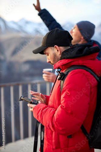 Launch of a drone in the mountains. Tourist controls the drone from the remote control with a smartphone
