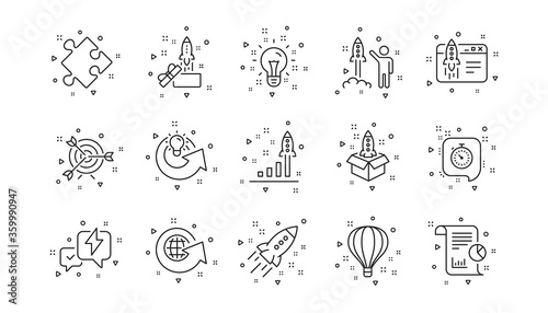 Launch Project, Business report and Target. Startup line icons. Strategy linear icon set. Geometric elements. Quality signs set. Vector