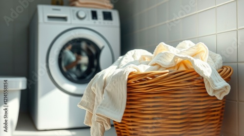 Laundry Day Serenity: Soft Cream Garments in a Rustic Basket near a Modern Washer