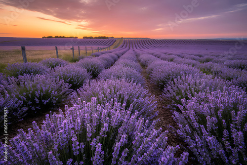 Lavender field at sunset with vibrant sky creating a stunning and serene landscape