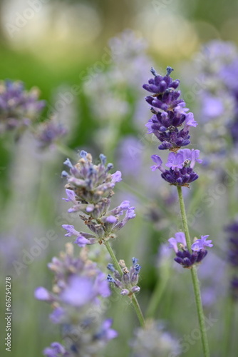 Lavender flower background with beautiful purple colors and bokeh lights. Blooming lavender in a field сlose up. Selective focus. The concept of sustainable development. nature conservation