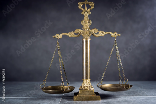 Law and Justice concept. Mallet of the judge, books, scales of justice. Gray stone background, reflections on the floor, place for typography. Courtroom theme.