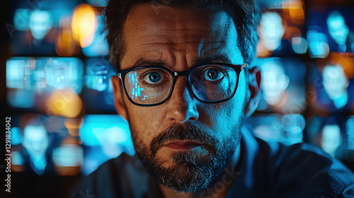 Law enforcement officer utilizes AI software for video evidence verification in a cyber-thriller atmosphere