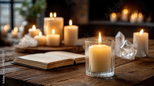 Law of attraction with goal and visualization for success concept. A serene setting with lit candles, a book, and natural ambiance.