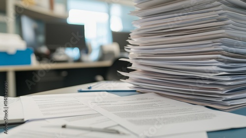 Laws and regulations healthcare concept. Cluttered desk with stacked papers and documents.