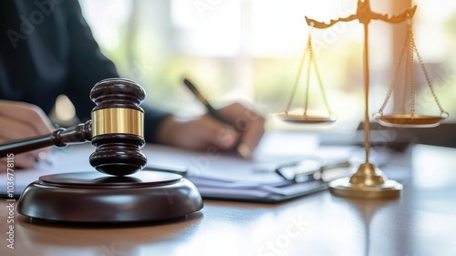 Lawyer working at desk with gavel and scales of justice in office setting.