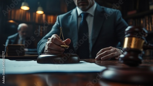 Lawyers Legal Advisors Businessmen brainstorm legal agreement details for correctness in contract documents In meetings with hammers and scales on the table : Generative AI
