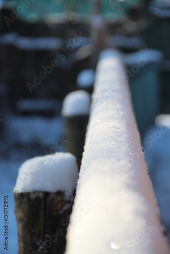 Layer of snow on the fence. Winter has come. Frosty weather. Countryside life