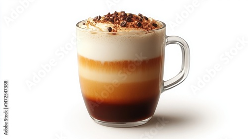 Layered Coffee Drink in Glass Mug Espresso Milk Cream Cocoa Topping