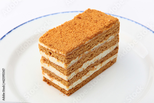 Layered honey cake highlighted on a white background. A piece of honey cake on white plate. Isolated object.