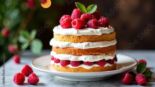 Layered raspberry cake with whipped cream and fresh mint garnish