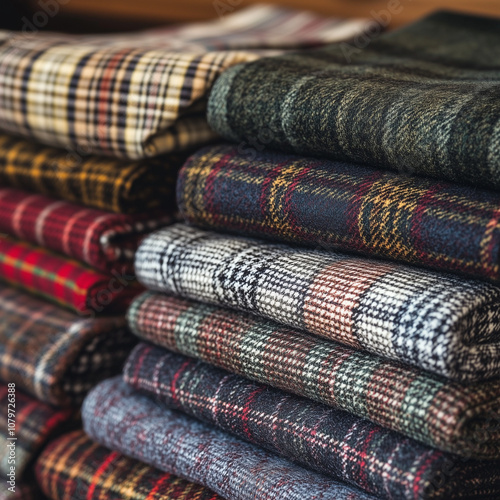 Layered tartan fabrics in various color patterns, neatly stacked, soft and warm lighting, close-up on fabric texture, focus on heritage and craftsmanship, cozy and inviting