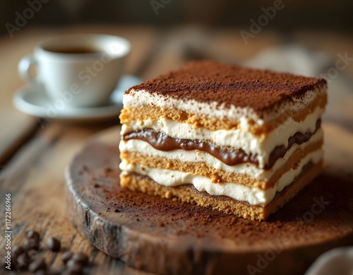 Layered Tiramisu Dessert: Rustic Wooden Board, Cocoa Dust, Creamy Delight