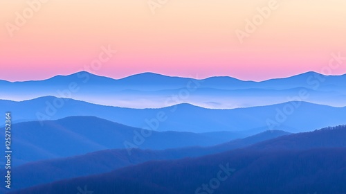 Layers of mountains at sunrise reveal a beautiful hazy gradient in shades of pink and blue