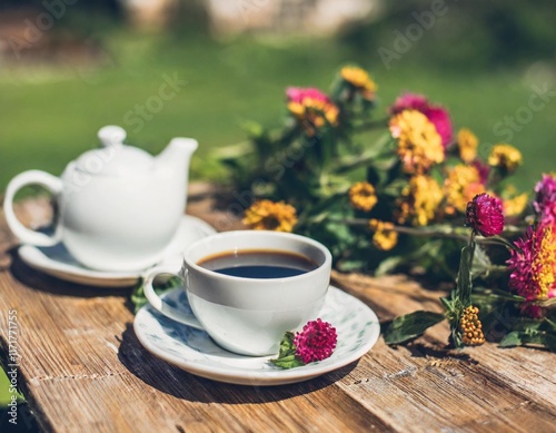 Lazy Mornings: Rustic Wooden Table, Fresh Flowers, and Warm Coffee