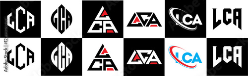 LCA letter logo design in six style. LCA polygon, circle, triangle, hexagon, flat and simple style with black and white color variation letter logo set in one artboard. LCA minimalist and classic logo