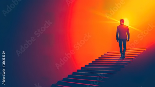 Leader standing at the top of a staircase with a spotlight shining, recognition and achievement theme